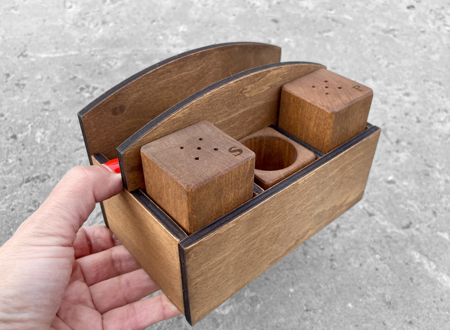 Дерев'яний набір для спецій з серветницею. Зручний та привабливий органайзер для серветок і спецій відмінно підійде для кафе чи ресторану.